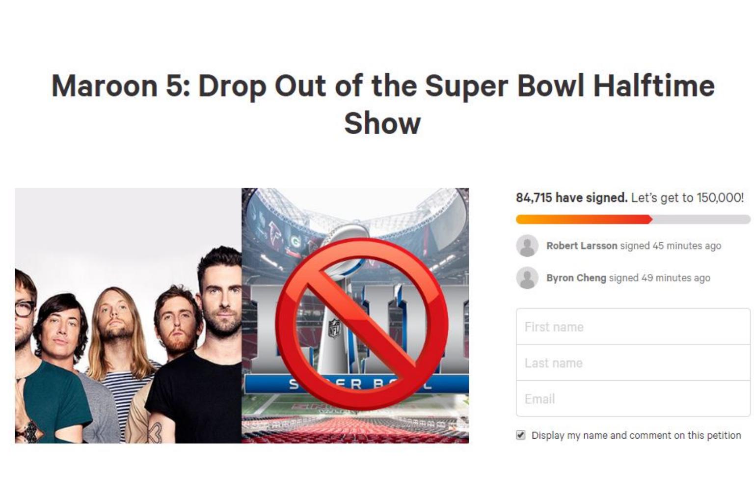 Maroon 5, whose participation had been speculated for months, had been lobbied to pull out. An online petition, at change.org, had nearly 85,000 signatures as of Sunday night.