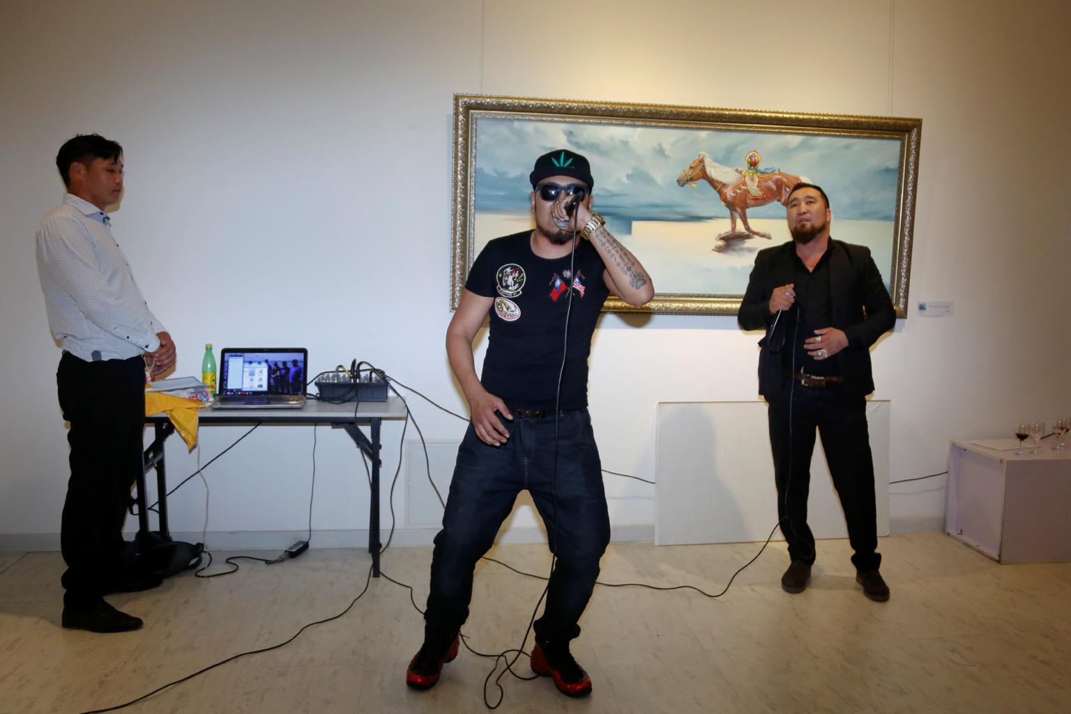Hip pop singers Battogtokh Odsaikhan and Sanjjav Baatar of the band Fish Symboled Stamp perform in an art gallery in Ulaanbaatar, Mongolia, on June 23, 2017.