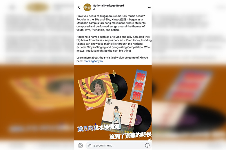 The post introduced xinyao singers such as Billy Koh and Eric Moo and directed readers to heritage portal roots.sg to learn more about the movement.