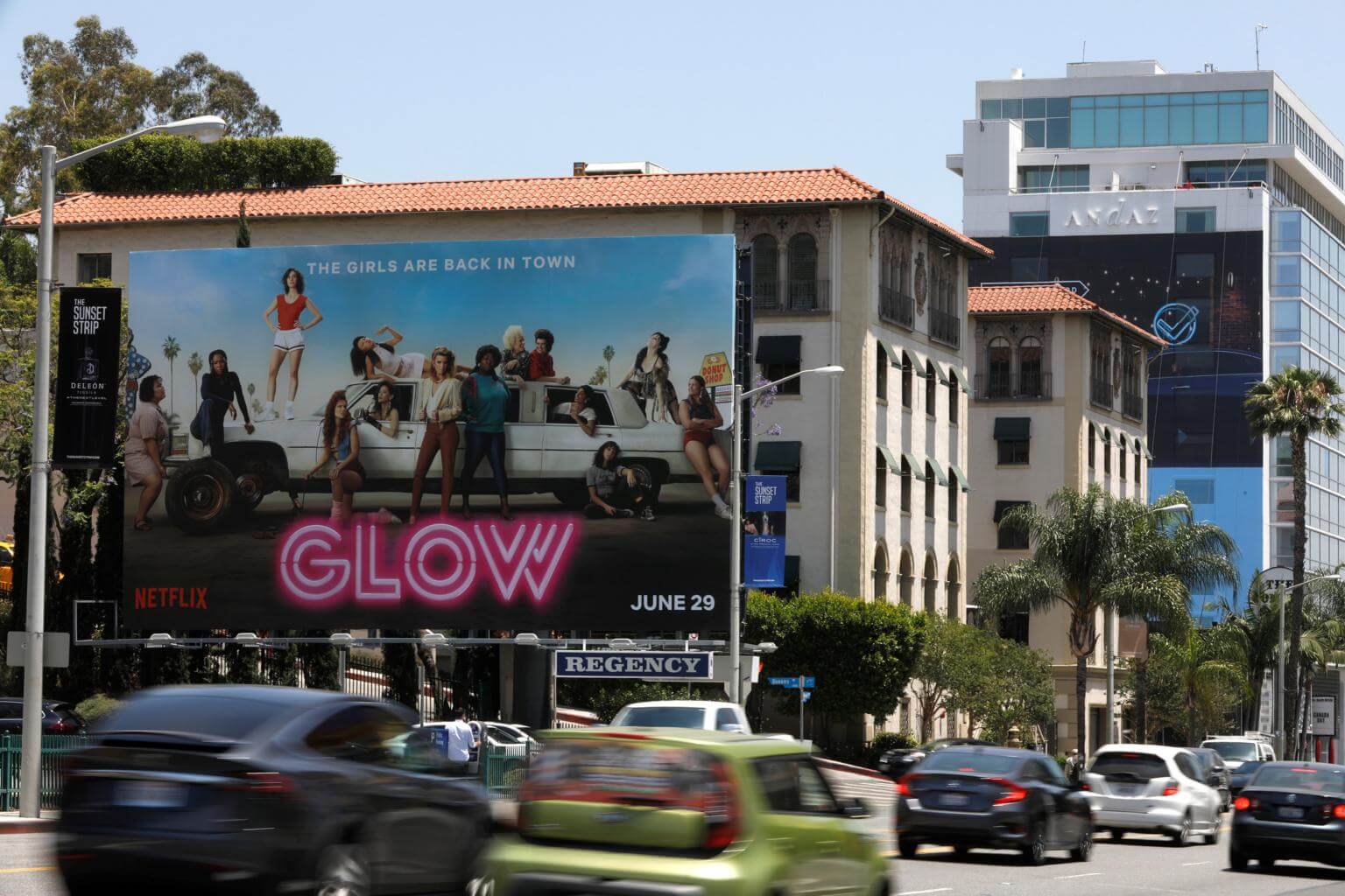 A billboard advertisement for Netflix's Glow on the Sunset Strip in Los Angeles, California, on June 28, 2018.