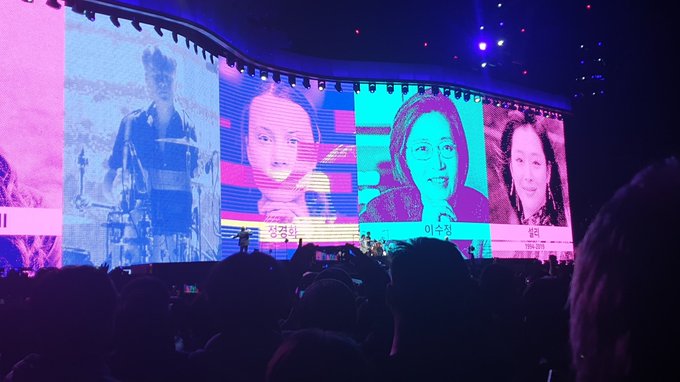 When they performed Ultraviolet (Light My Way), photos of women, who had made headlines in South Korea, were shown on screens.