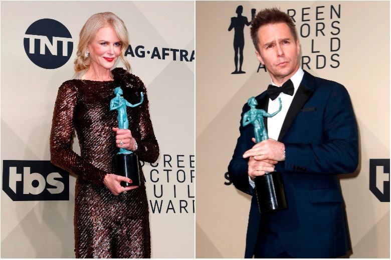 Winners Nicole Kidman (left) and Sam Rockwell pose with their SAG Award trophies during the 24th annual Screen Actors Guild Awards ceremony in Los Angeles on Jan 21, 2018.
