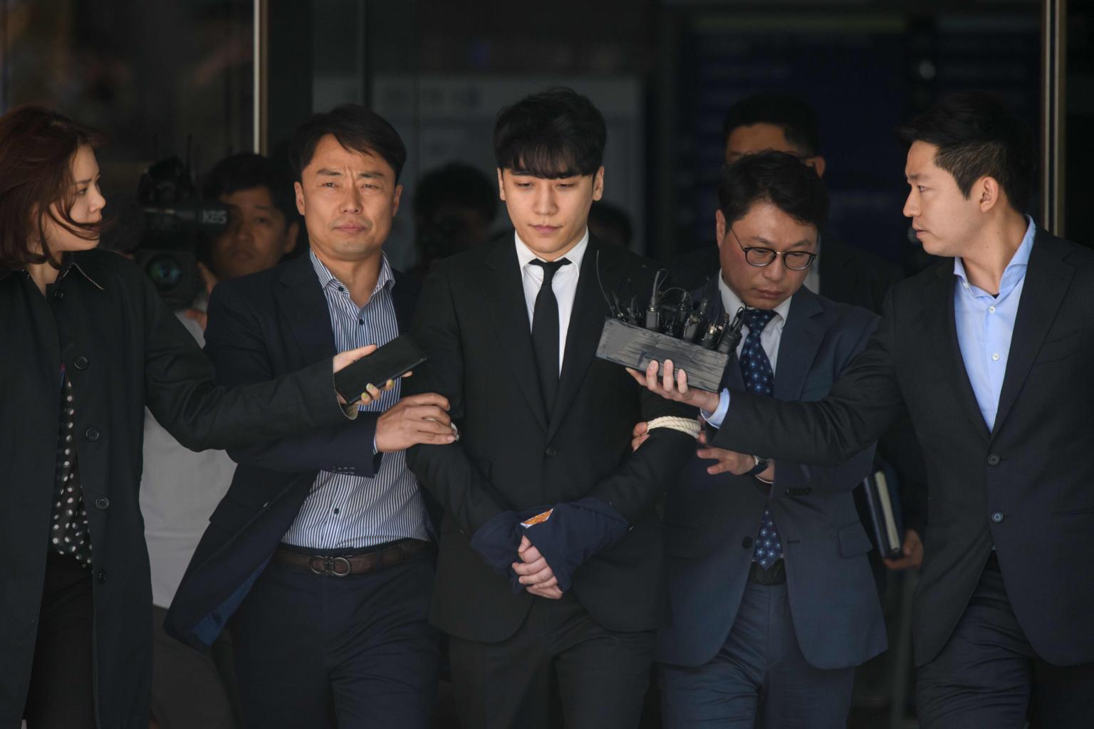 Former BigBang singer Seungri (centre) is taken into custody as he leaves the High Court in Seoul on May 14, 2019.