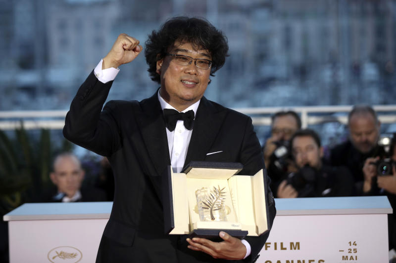 Director Bong Joon-ho with the Palme d'Or award for Parasite during a photo call following the awards ceremony at the 72nd international film festival, Cannes on May 25, 2019.