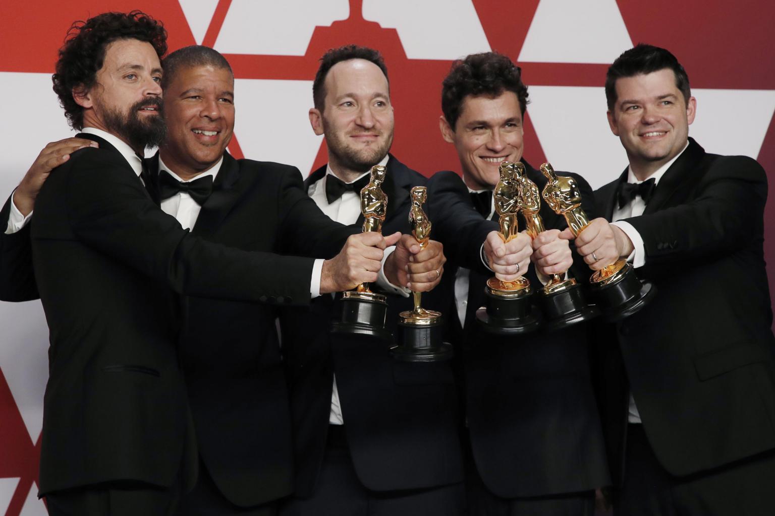 Bob Persichetti, Peter Ramsey, Rodney Rothman, Phil Lord and Christopher Miller with the Best Animated Feature Film award for Spider-Man: Into The Spider-Verse.