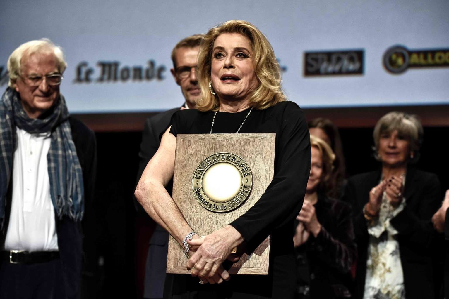 French actress Catherine Deneuve reacts after receiving the Lumiere Award during the Eighth edition of the Lumiere Film Festival, on Oct 14, 2016 in Lyon, central eastern France.