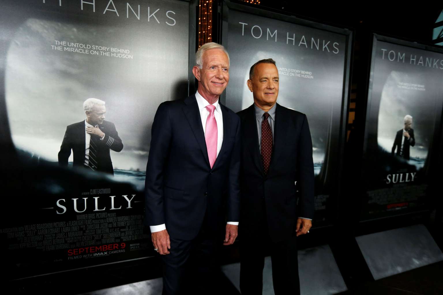 Tom Hanks (right) poses with the real Captain Chesley "Sully" Sullenberger at the premiere of Sully in Los Angeles on Thursday (Sept 8).