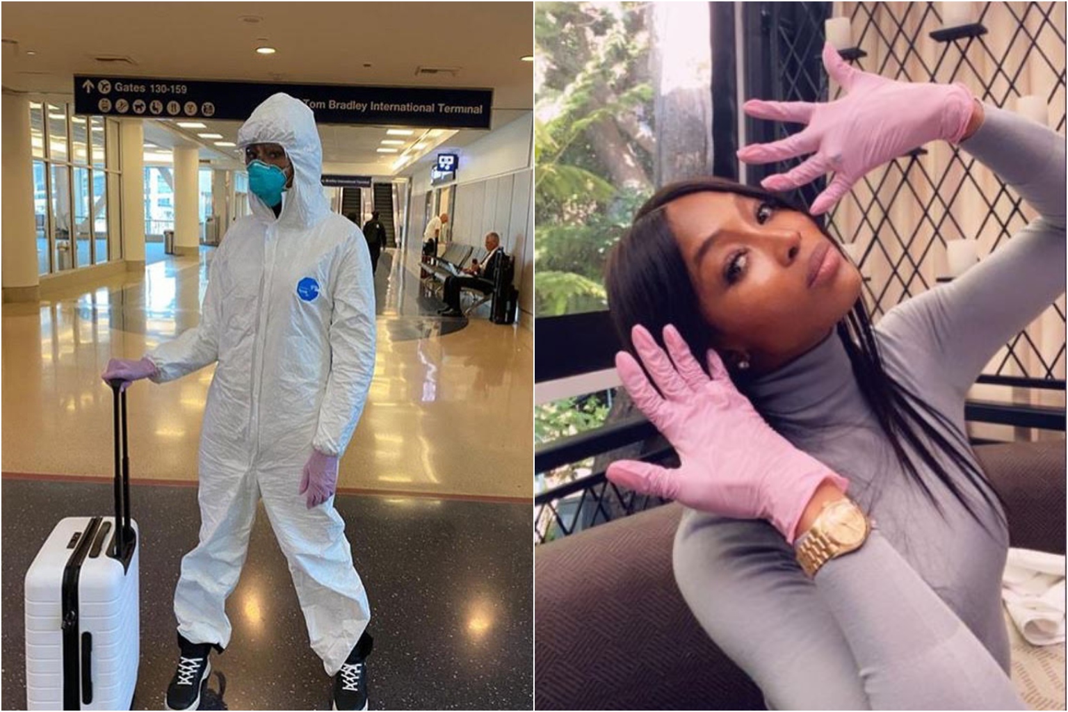 Naomi Campbell posted a picture on her Instagram page of herself travelling in a full hazmat suit, complete with goggles, a surgical mask and pink rubber gloves.