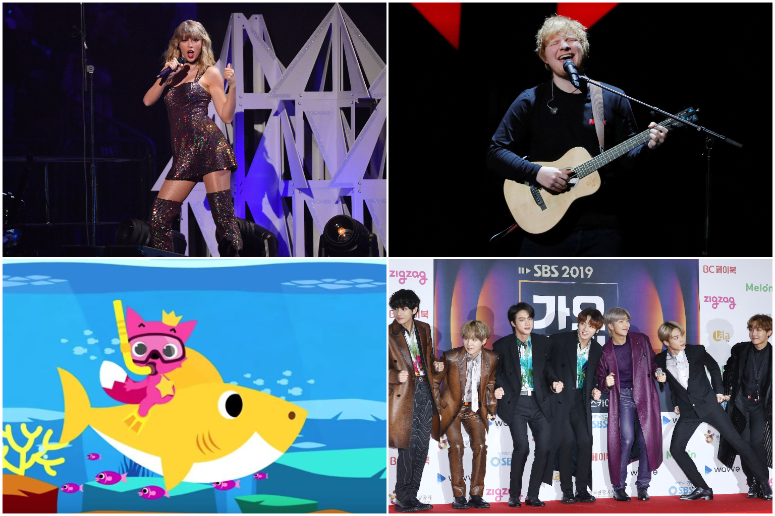 (Clockwise from top left) Taylor Swift, Ed Sheeran, BTS and Baby Shark Dance.