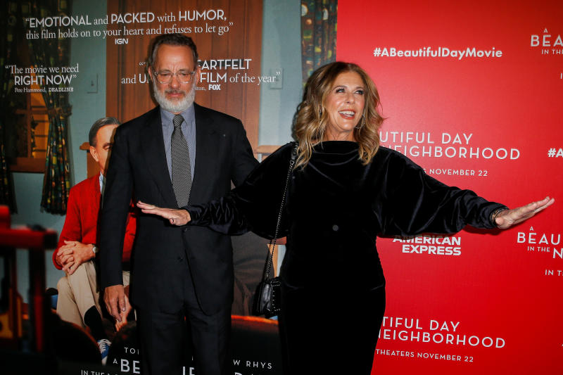 A photo taken on Nov 17, 2019, shows Tom Hanks and his wife Rita Wilson at the New York screening of A Beautiful Day In The Neighborhood.