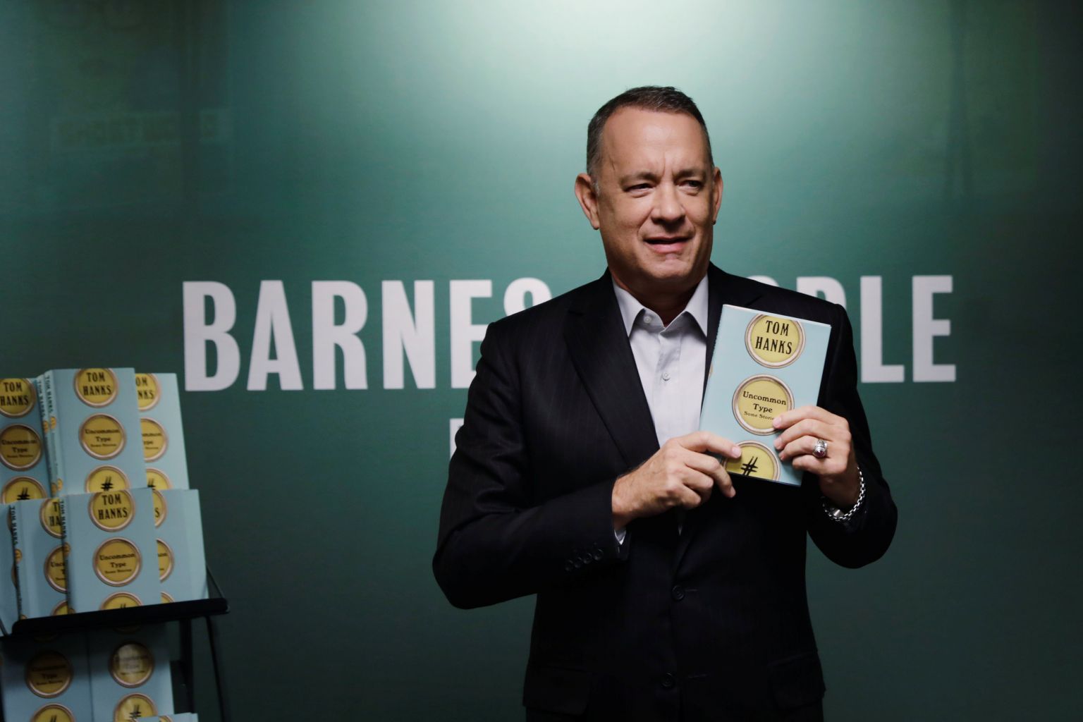 Tom Hanks holds a copy of his book at a promotional event for Uncommon Type: Some Stories, in New York.
