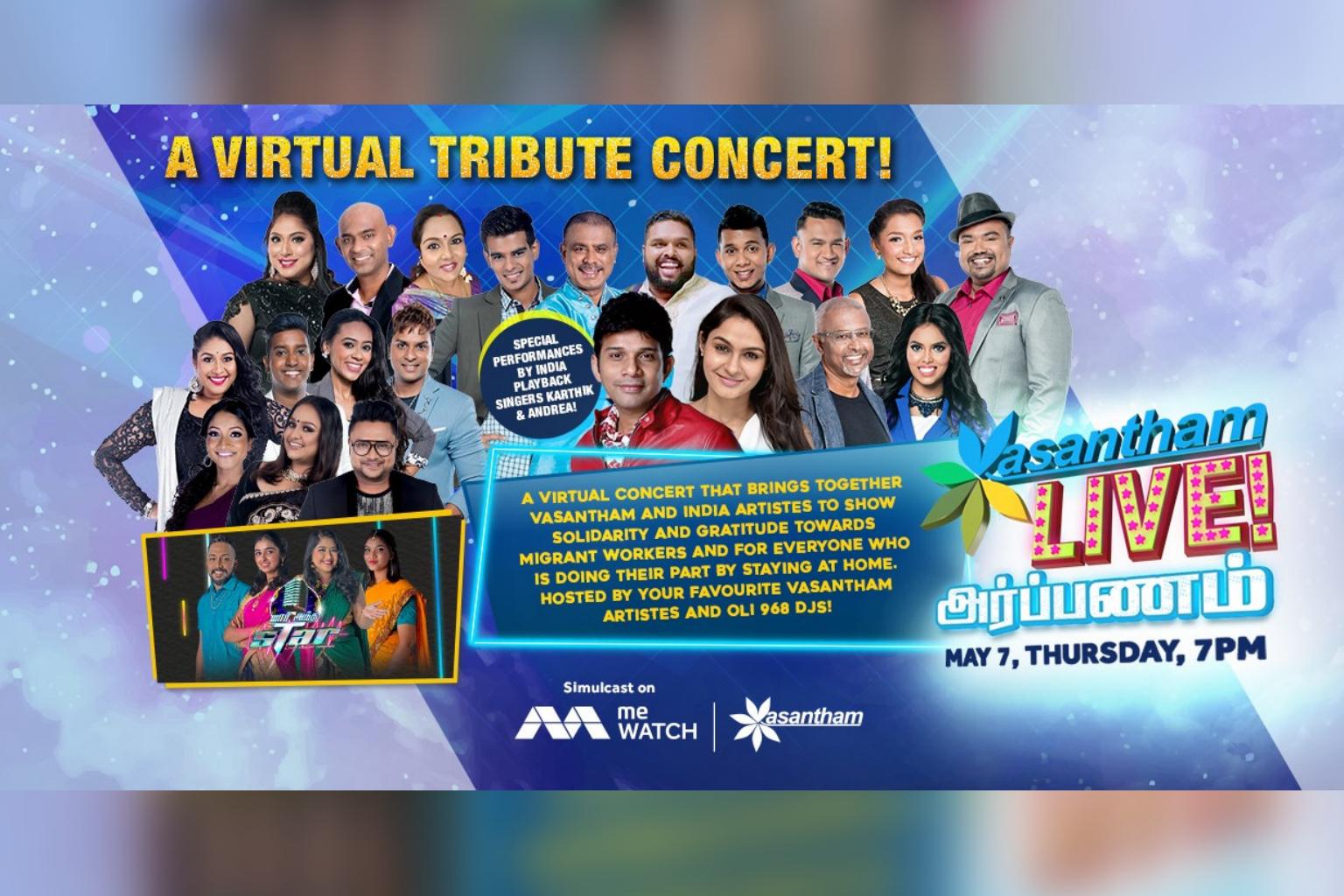SINGAPORE - Vasantham is putting together a virtual tribute concert called Vasantham Live! Arpanam on Thursday (May 7), to give thanks to migrant workers, as well as everyone staying at home under this extended circuit breaker period.