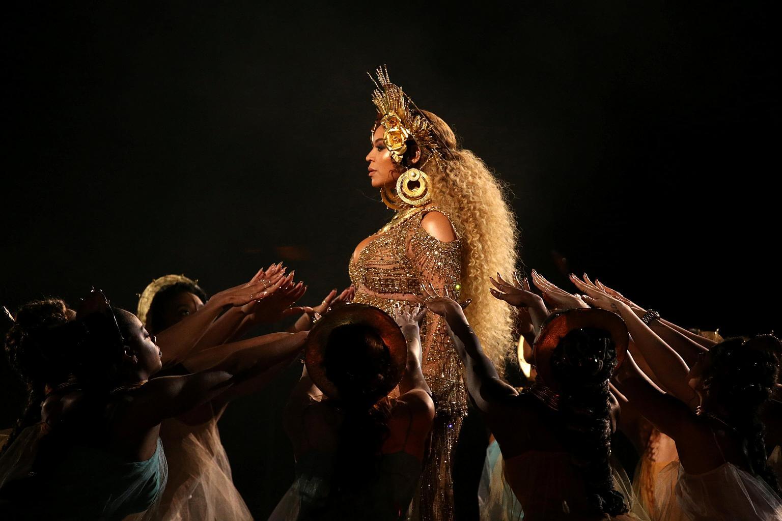 Beyonce performs at the 59th Annual Grammy Awards in Los Angeles.