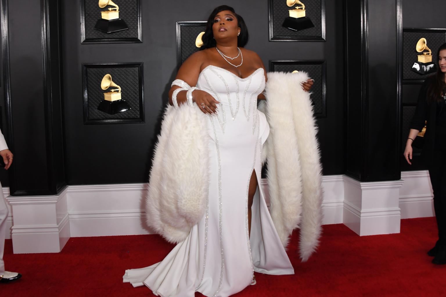 Lizzo stunned in a strapless white Versace corset gown with Swarovski crystals sewn in by hand.