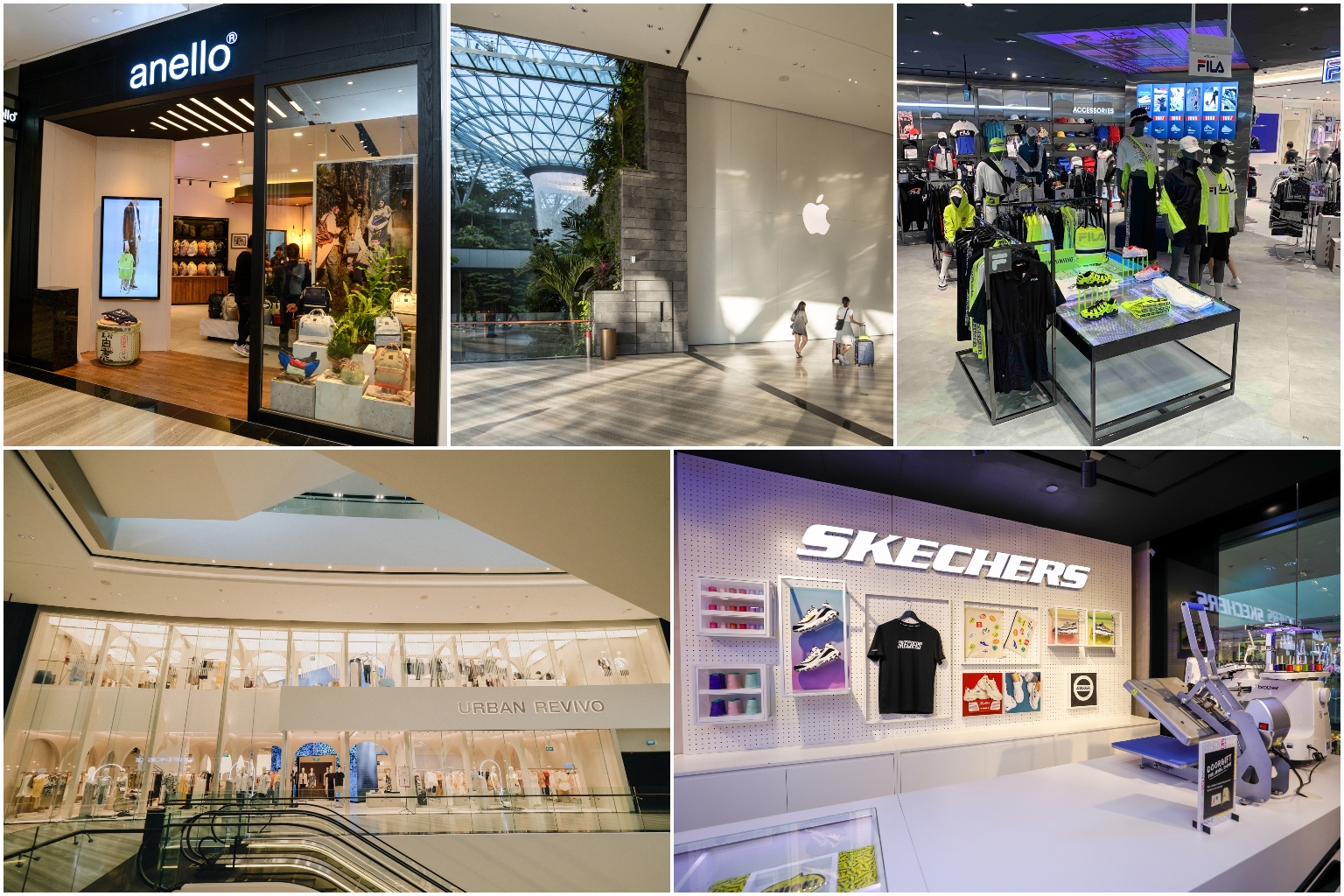 (Clockwise from top left) Anello Jewel Changi Airport, Apple Jewel Changi Airport, Fila Jewel Changi Airport, Skechers Jewel Changi Airport and Urban Revivo Jewel Changi Airport.
