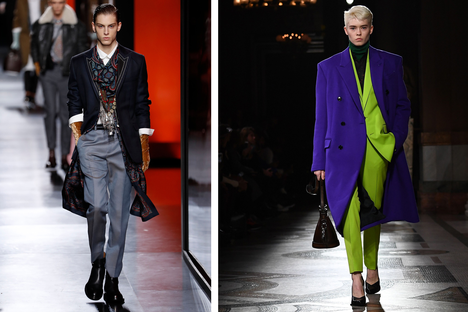 Kim Jones' collection for Dior (left) at the men's Paris Fashion Week was upscale and decadent, while Kris Van Assche played with bold rich hues in his Berluti collection (right).