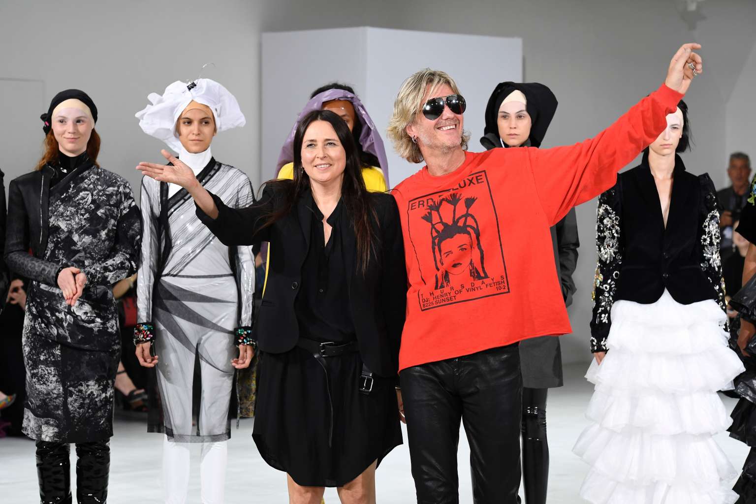 Belgian fashion designers Filip Arickx (right) and An Vandevorst for A.F. Vandevorst at the end of the 2017-2018 fall/winter Haute Couture collection in Paris on July 2, 2017.