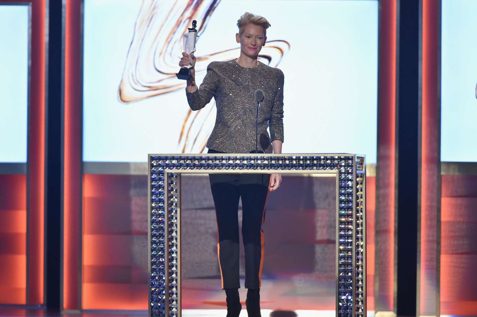 Actress Tilda Swinton (above) accepted the Board of Director’s Tribute Award on behalf of Bowie’s widow, Iman.