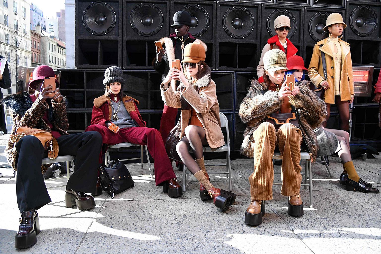 The music - so ubiquitous at fashion shows - blared out of loudspeakers as guests and models found themselves in a mobile phone face-off on a bitterly cold February afternoon.