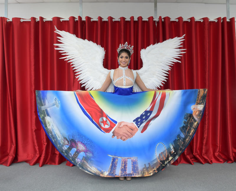 The costume, which was unveiled on Thursday (Nov 29), featured a skirt digitally printed with a handshake - one arm features the North Korean flag and the other, the American flag - over the Singapore skyline. North Korean leader Kim Jong Un and United States President Donald Trump had met in Singapore in June.