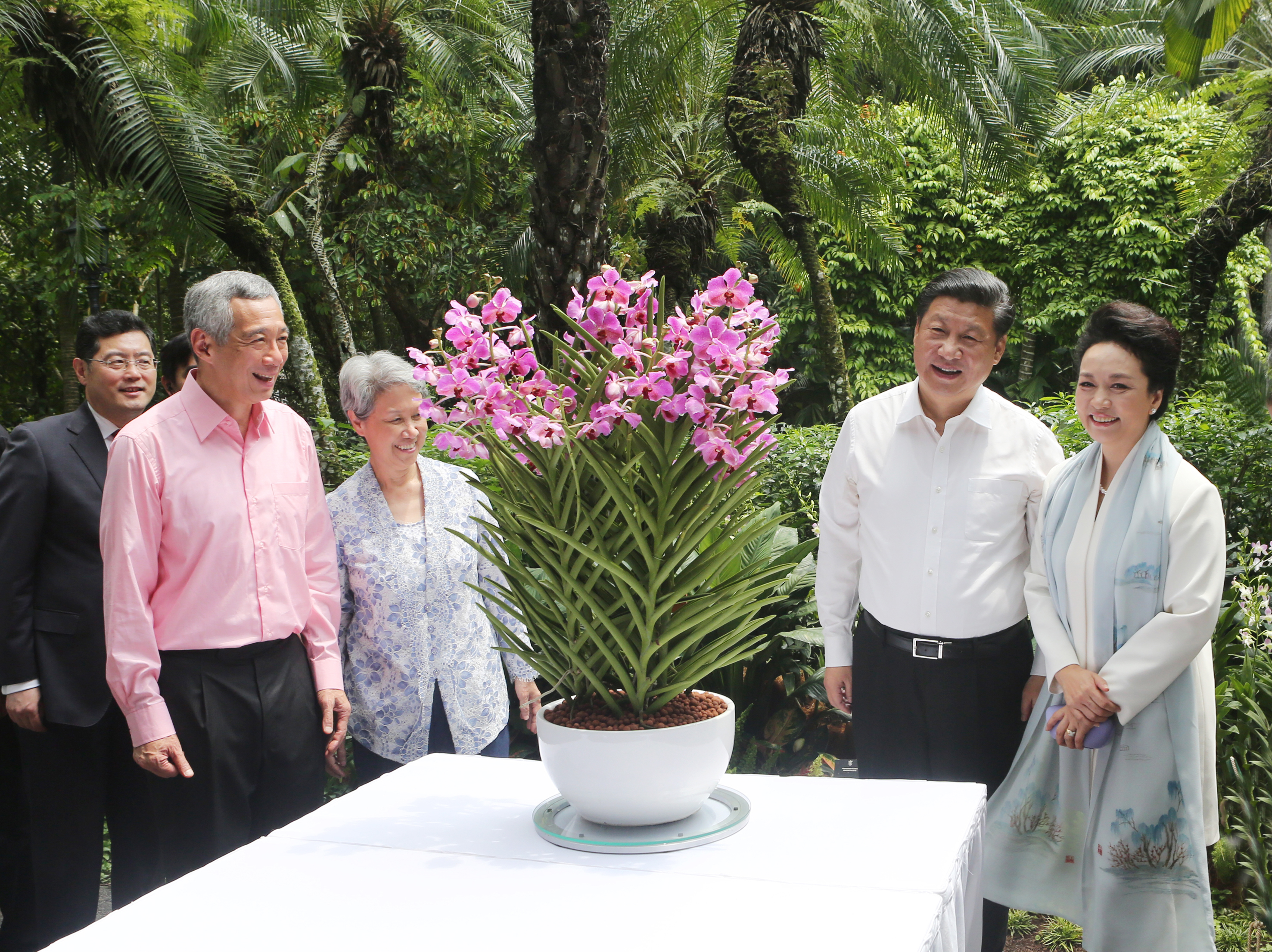 At the Singapore Botanic Gardens with Prime Minister Lee Hsien Loong and his wife Ho Ching: Mr and Mrs Xi Jinping were at the Botanic Gardens where they had an orchid named in their honour. The orchid-naming ceremony was followed by lunch with Mr and Mrs Lee at the Corner House restaurant in the Gardens.
