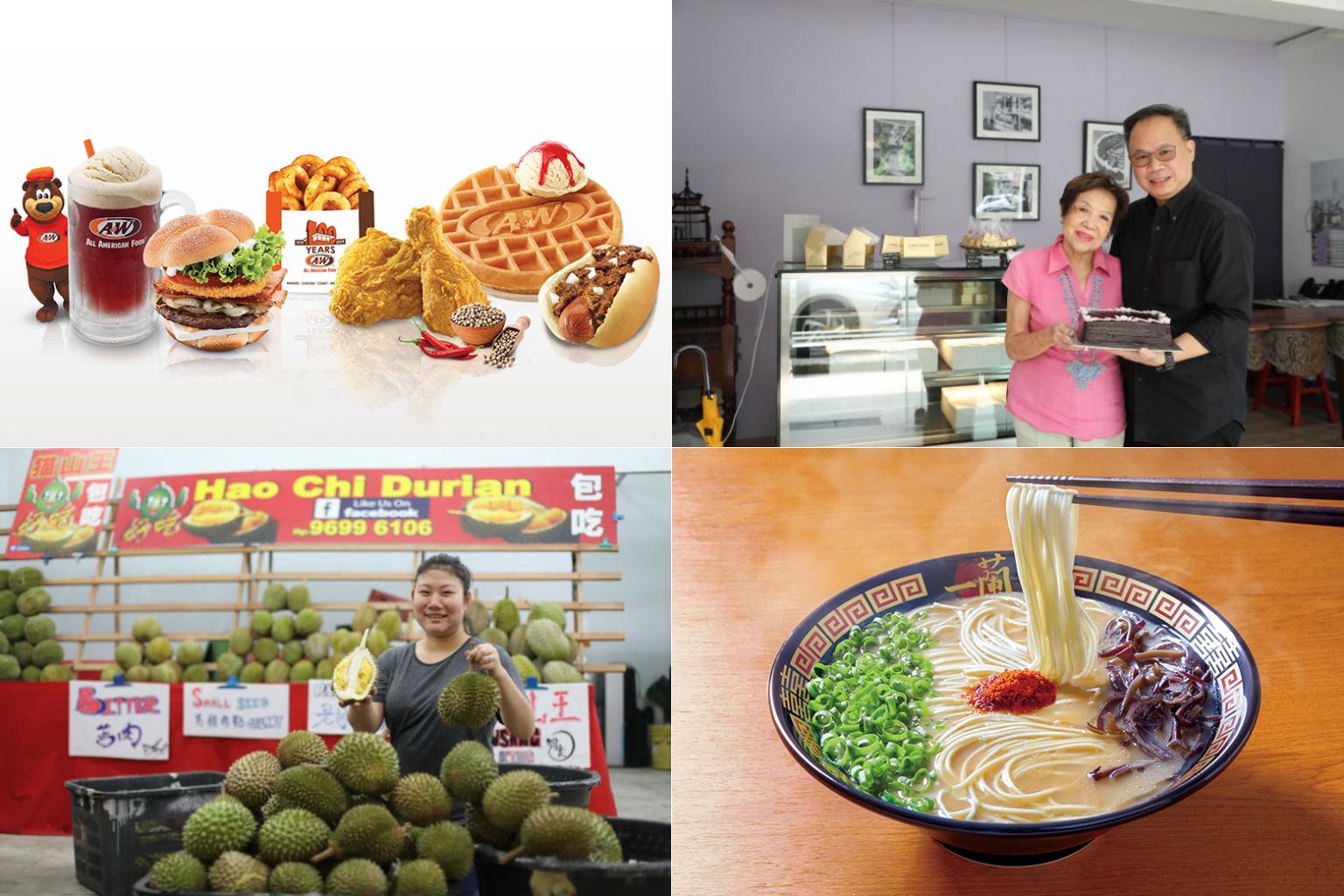 (Clockwise from top left): Food items from A&W, Mrs Violet Kwan of Lana Cake Shop and her son Jason Kwan, ramen from Ichiran Japan and Hao Chi Liu Lian owner Wong Sha Hui with her $5 durians.