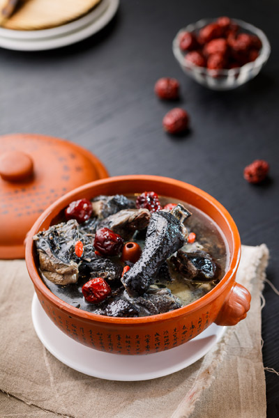 1. Wash the black chicken inside and out. Cut off the tail and trim the fat, especially inside the cavity and around the neck. Drain and keep whole. Stuff the huaishan and wolfberries inside the chicken. Heat up boiling water in a clay pot and add the chicken and ginger.