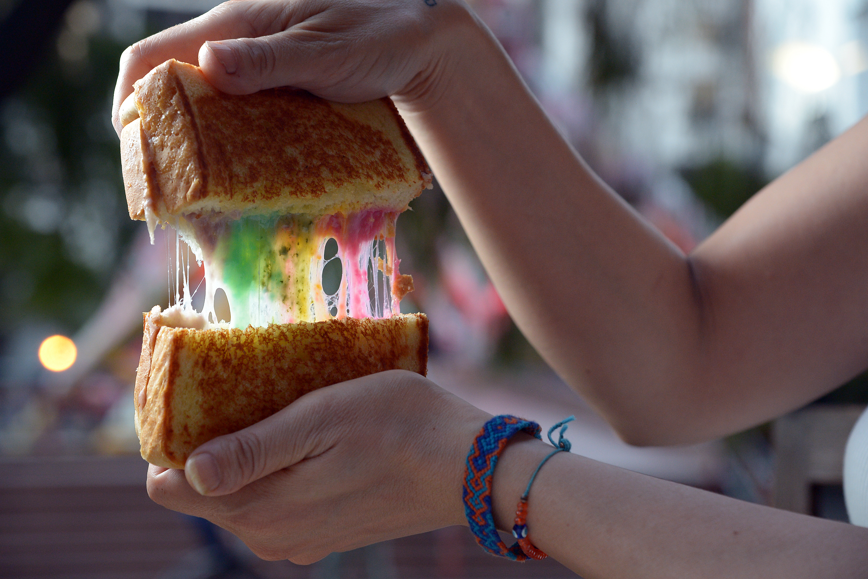 The grilled cheese sandwich ($9) is filled with a cheese mixture made up mainly of mozzarella, and truffle oil. To achieve the rainbow colours, vegetable puree is mixed into the cheese - beetroot is used for pink, carrot for orange and yellow, spinach for green, potato and butterfly pea flower for blue, and red cabbage for violet. A small amount of liquid food colouring is used as well to enhance the colours.