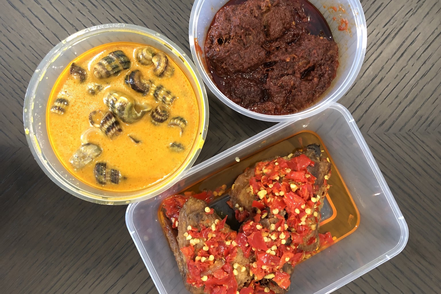 (Clockwise from top right) Beef Rendang, Ayam Balado Merah and Gulai Siput Sedut .