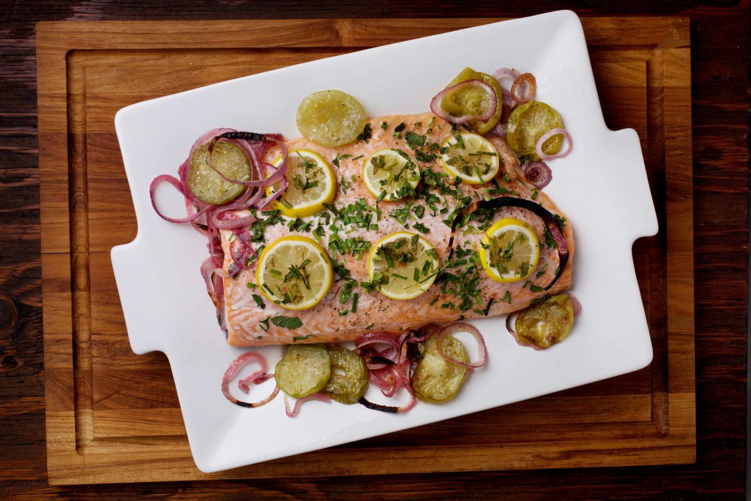 5. Add the oil to the mixing bowl, then season with a good pinch each of the salt and pepper. Toss to coat evenly and incorporate. Spread the mixture on the parchment-lined baking sheet. Lay the salmon over the tomatillo mixture, then season the fillet lightly with salt and pepper. Lay the lemon slices on the salmon, then scatter the chives and cilantro evenly over the top. Roast (middle rack) for 20 minutes, or until the interior temperature of the salmon registers 48 to 52 deg C. Carefully transfer the salmon to a platter, discarding any skin that remains on the baking sheet. Increase the oven to 245 deg C and return the baking sheet with the tomatillo mixture to the oven. Roast for 10 minutes, or until the onions and tomatillos begin to crisp around the edges. Serve the tomatillos and red onion slices alongside the salmon, warm.