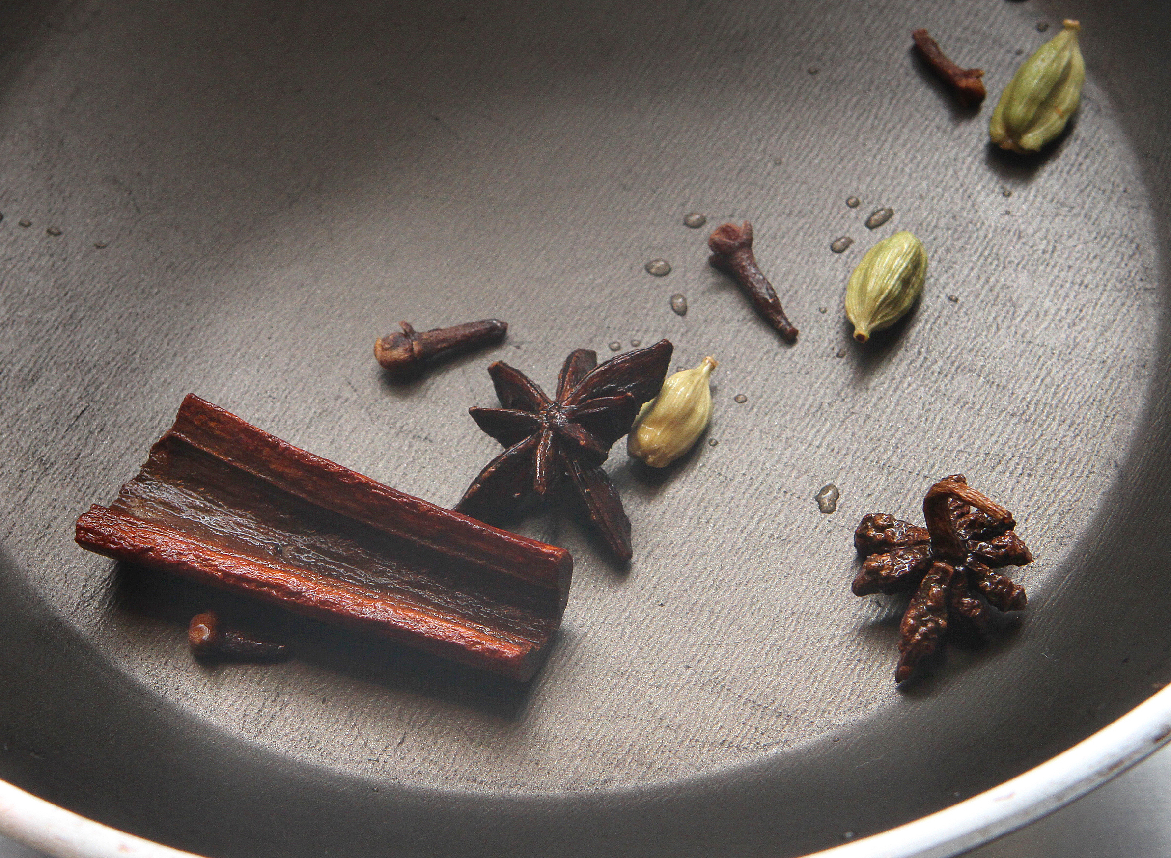 7. Add the fried cardamom, cinnamon, cloves and star anise.
