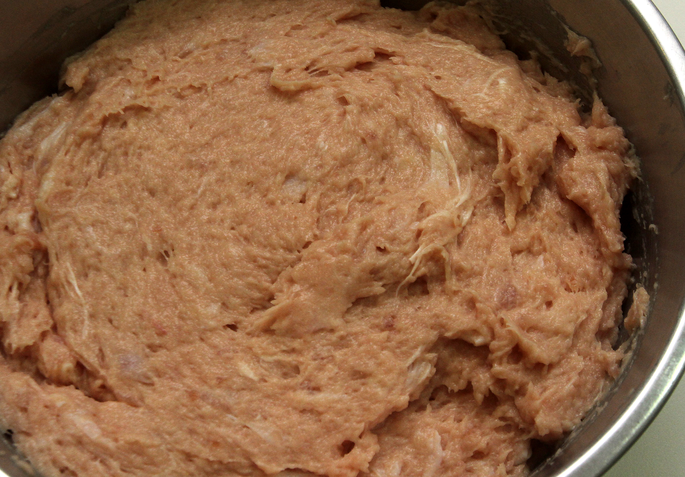 2. Remove the chicken meat from the fridge and place half in food processor. Pulse to mince the meat finely. Remove and mince the remaining chicken meat. Doing this in two batches ensures an even mince.