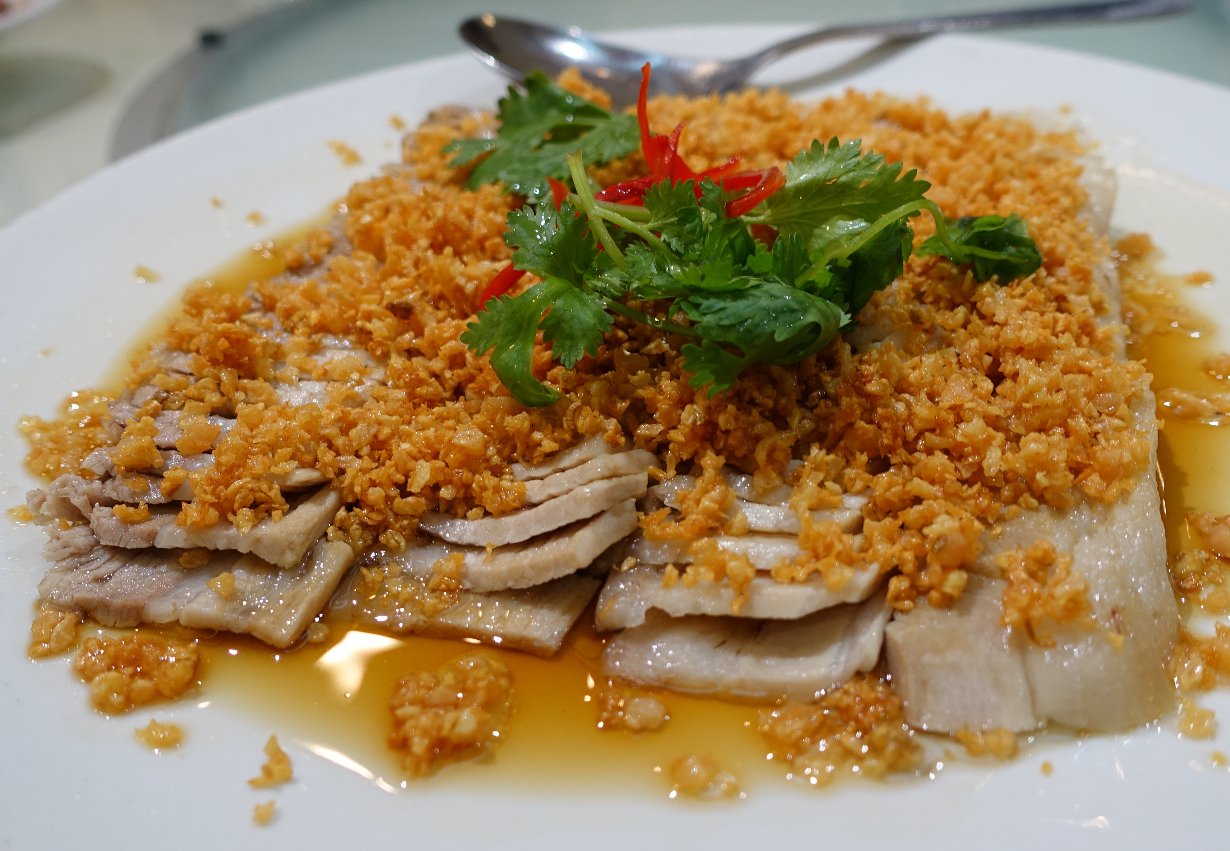 However, two dishes stood out for me: Crystal Chicken ($36, above) and sliced belly pork topped with crisp garlic (from $15, left).