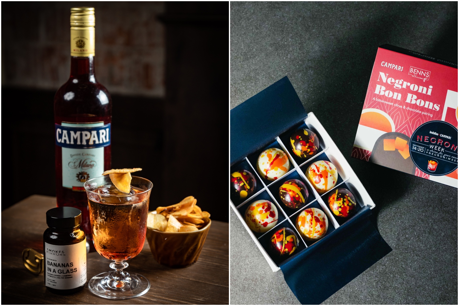 Bananas In A Glass by Eduardo Zamora of Smoke & Mirrors (left) and Negroni Bon Bons by Campari and Benns Ethicoa.