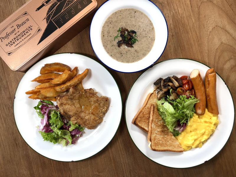 Cream Of Mushroom Soup, All-Day Breakfast Set and Grilled Chicken With Truffle Sauce from Professor Brawn Bistro.