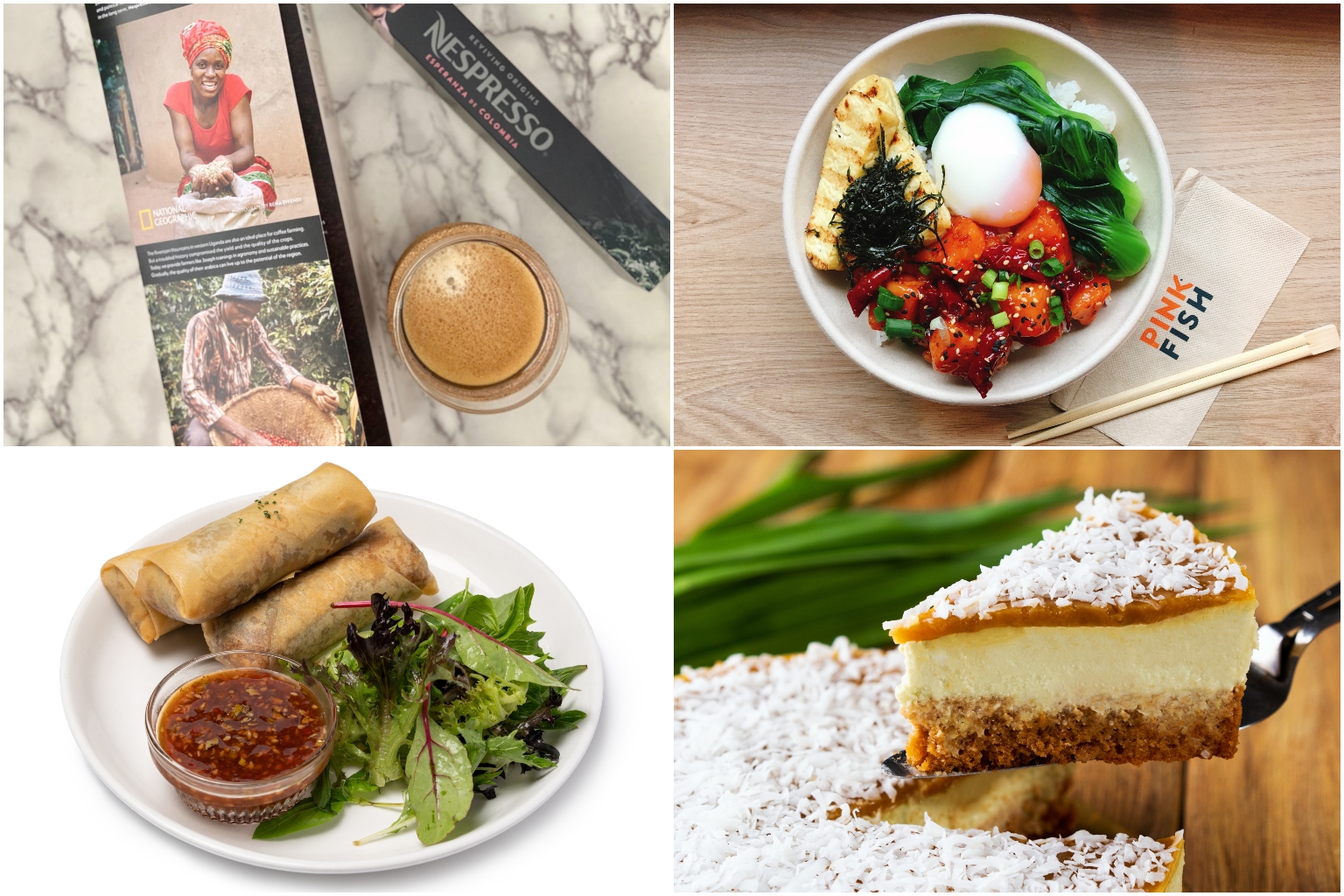 (From top left, clockwise) Nespresso capsules, mala salmon poke bowl, Gula Me Gusta cheesecake and spicy mushroom spring rolls.