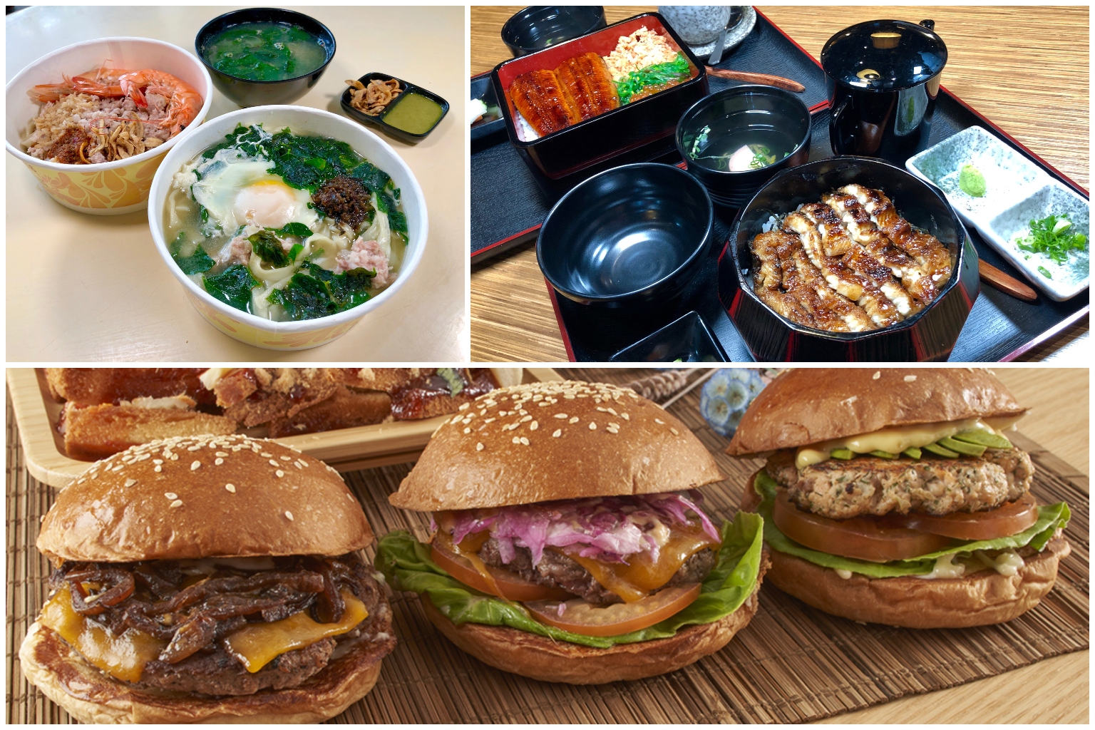 (Clockwise from top left) Ban Mian from Bossi Ban Mian, Unagi dishes from Una Una and burgers from Wolf Burgers.