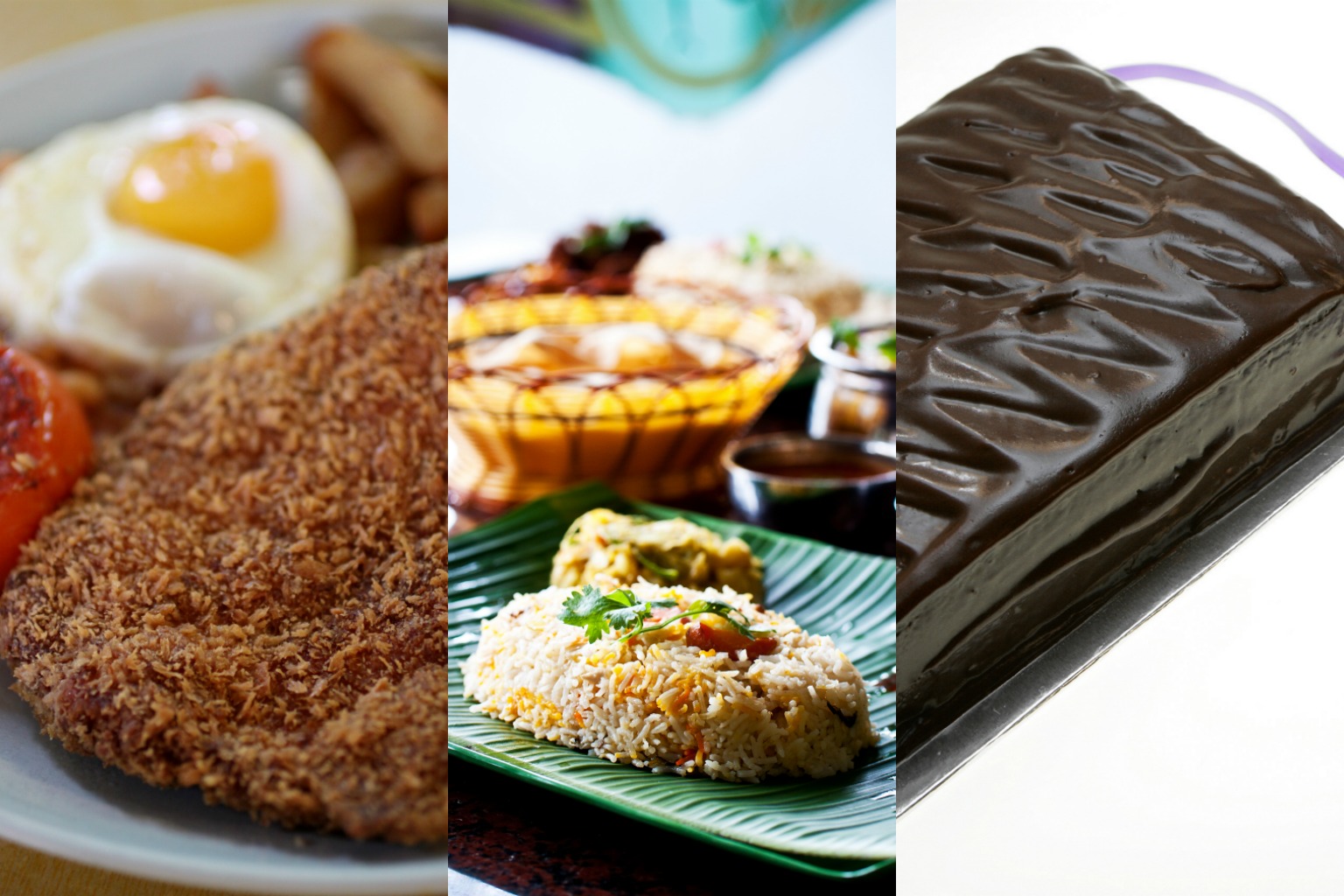 (From left) Chicken Maryland from Colbar Restaurant, Nasi Briyani from The Banana Leaf Apolo and Lana Cakes' chocolate fudge cake.