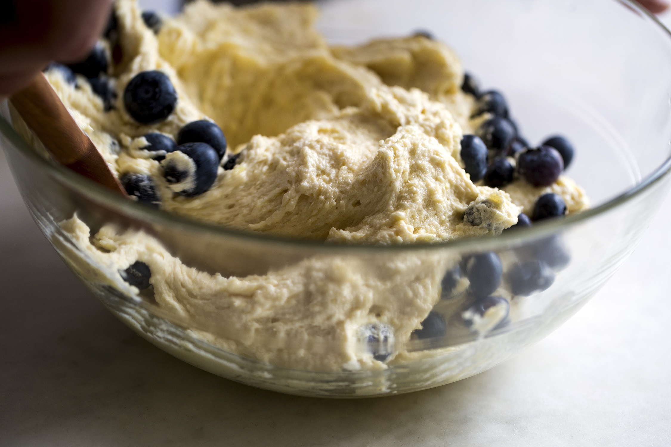 3. In a separate bowl, whisk together flour, baking powder, salt and almond flour. With the stand mixer on low, add the dry ingredients in three additions, mixing just until no white specks remain. Fold in about 3/4 of the blueberries by hand, then scoop batter into the prepared loaf pan.