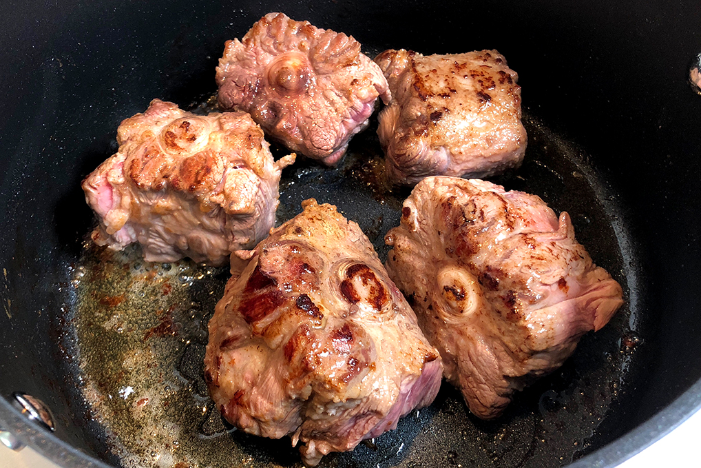 1. Add the butter into the pot over medium heat. As the butter begins to melt and sizzle, add the oxtail and fry for 8 minutes, turning over each piece of oxtail at intervals to ensure all sides are browned.