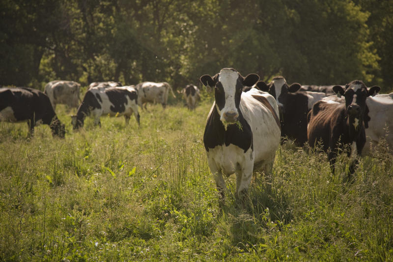 Grass-fed dairy cattle roaming on a farm pasture in the United States.