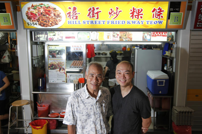 Hill Street Fried Kway Teow founder Ng Chang Siang (left) with his son, Mr Ng Yeow Kiat, at their stall in Bedok South Market & Food Centre.