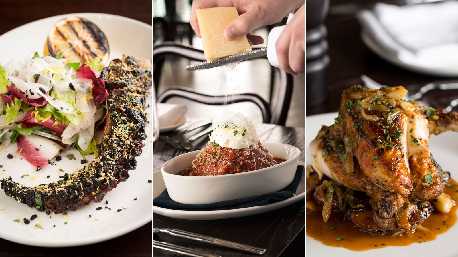 (From left) Charred Octopus ($32), "The Meatball" ($38), and Crispy Chicken "Dominick" (S$48).
