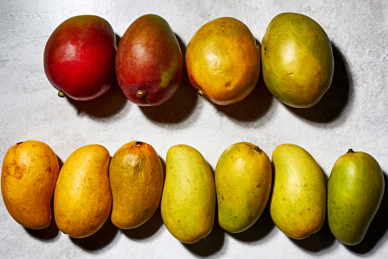 The ripening cues are a bit different, depending on which of the above varieties you buy. It is easy to tell when Champagnes are ripe. The colour will change from green to yellow to almost gold, and the fruit will soften and even get wrinkly on the outside. The green-red varieties will not similarly change colours on the outside. They should yield to pressure from a gentle squeeze and smell sweet and fragrant at the stem end. Mangoes can be ripened on the counter at room temperature, placed in a closed paper bag to speed up the process (putting an apple or banana in the bag will help even more). Store ripe fruit in a plastic bag in the refrigerator for about a week, give or take.