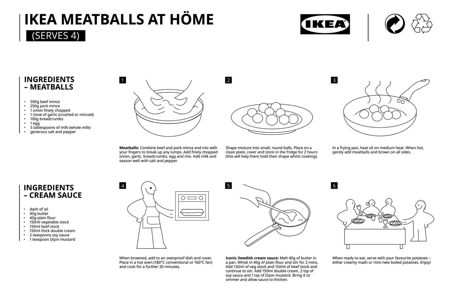 The recipe, presented in the form of a typical Ikea manual, guides readers through the six-step preparation of the dish, which is made of ground beef and pork and served in cream sauce.