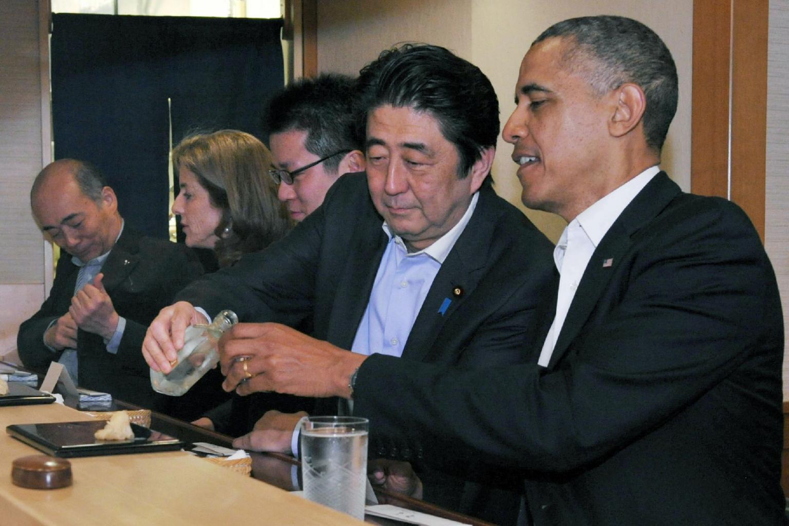 A photo taken on April 23, 2014, shows Japan's Prime Minister Shinzo Abe (left) and former US President Barack Obama at the Sukiyabashi Jiro restaurant in Tokyo.