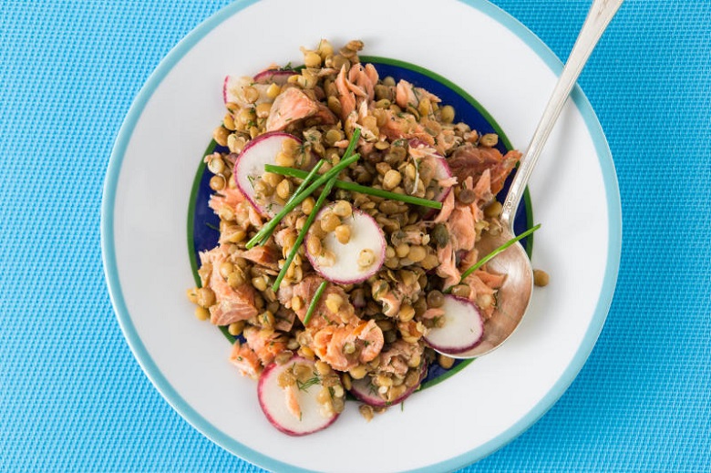 2. Cut the salmon into four equal portions or flake the salmon into the lentil salad and toss gently to incorporate, then divide among individual plates.
