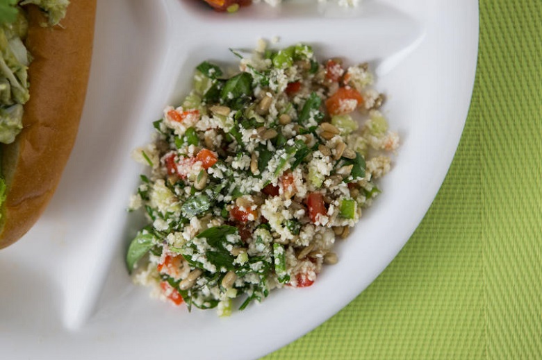 A quick side dish gets even quicker when you can pick up the cauliflower already broken down to a couscous consistency - typically found these days in the refrigerated or frozen produce section. The dressing components go right into the salad.
