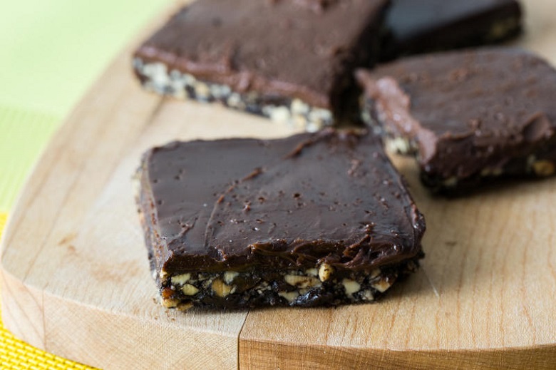 Chopped dried cherries enhance the chocolaty flavor and richness of this easy dessert or snack. The chocolate does need to be melted in the microwave, this is not truly a no-cook recipe. But making it will not heat up your kitchen and that is the goal. The assembled bars are easier to handle with at least 20 minutes of chill time. Store or pack them in a single layer; wrapped well (once they are firm), they can be frozen for up to 1 week.
