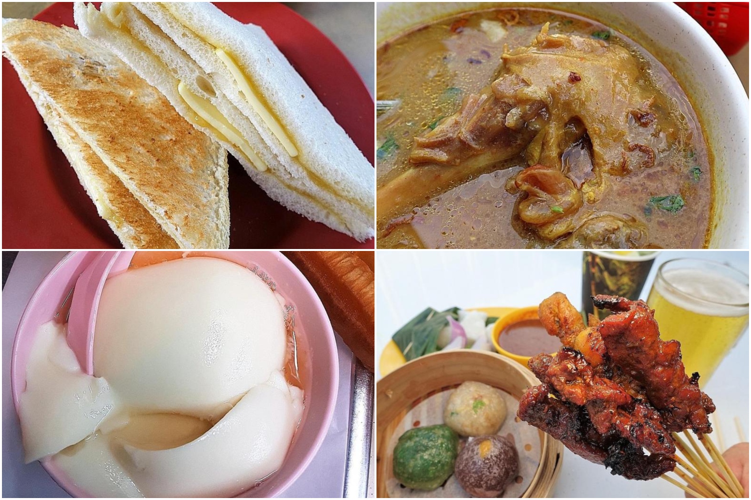 (Clockwise from top left) Roti kaya at Keng Wah Sung Coffeeshop, sup kambing at M A Deen Biasa, satay and dim sum at Gluttons Bay and tau huay at Rochor Beancurd.